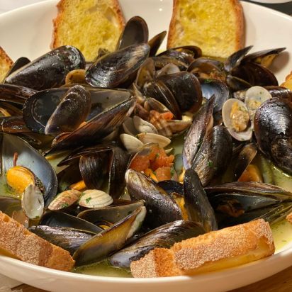 Cozze alla marinara Spiedini di gamberi al Cognac Fumetto di pesce Risotto agli scampi, crema di burrata e polvere di cappero Pesce al sale, salsa al limone e timo Mousse di mela verde