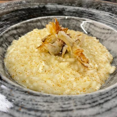 Risotto Carnaroli, crema di Carciofi e Bottarga di Cabras Risotto Vialone, erborinato, mele e cannella Risotto Carnaroli, zucca Beretta, crescenza e mostarda di agrumi